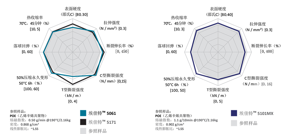 出色的發泡性能:與參照的改性劑對比中,埃佳特™ 5061,埃佳特™ 5171(左圖)和埃佳特™ 5101 MX(右圖)在關鍵特性(如壓縮永久變形,表面硬度和斷裂伸長率) 表現出優異的性能。